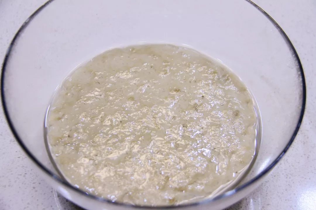 5.面团盖上保鲜膜,室温松驰1-2小时,面团摊开变得细腻些,还会析出部分水。