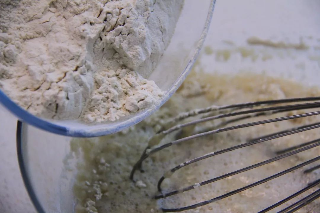 4.面筋预拌粉慢慢的倒入碗中,并不断的搅拌,最成揉成一个带有一些孔洞略显粗糙但很有弹性的软面团。
