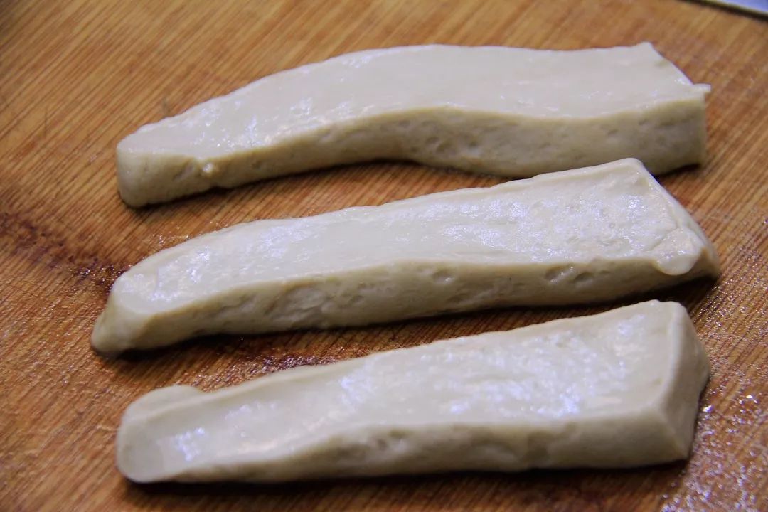 6. 将松驰好的面团摊开放在面板上,切成小条。