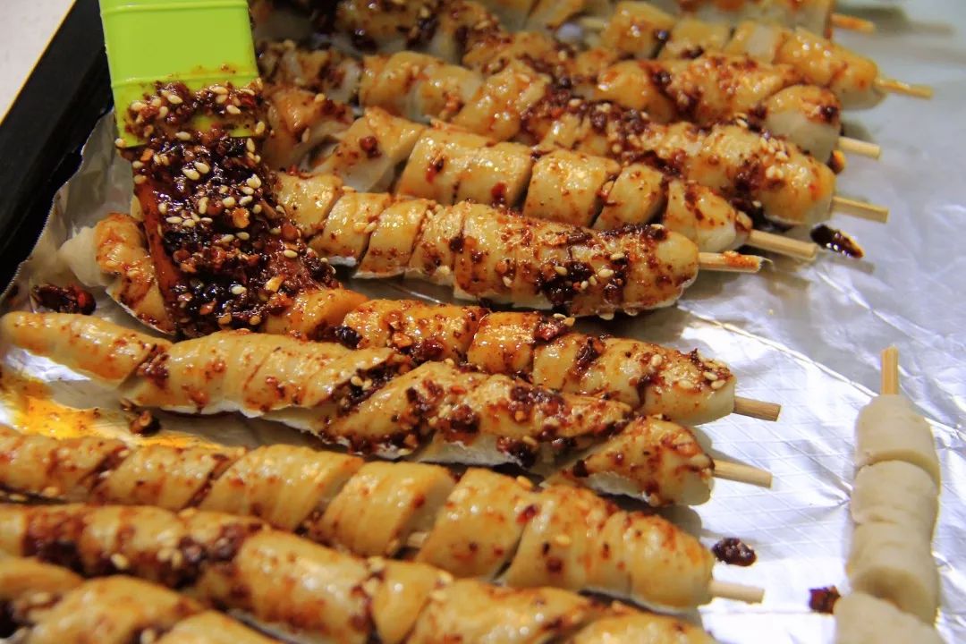 13. 将面筋均匀的刷上辣椒油,排入垫了锡纸的烤盘,放置约30分钟再烤更入味。