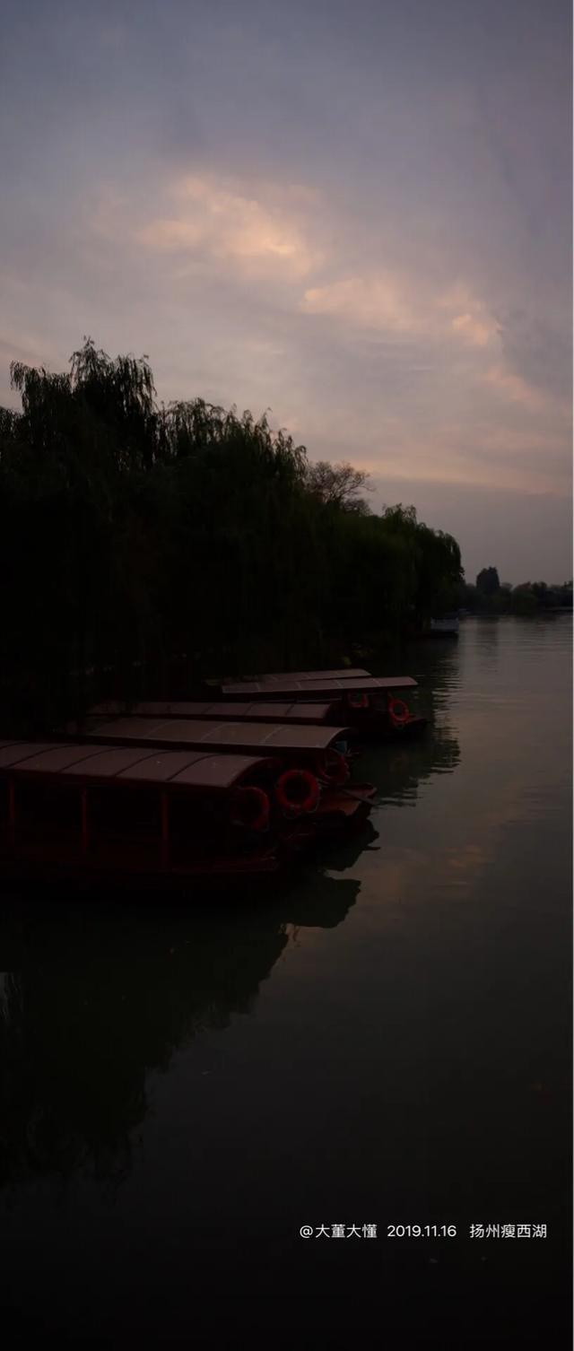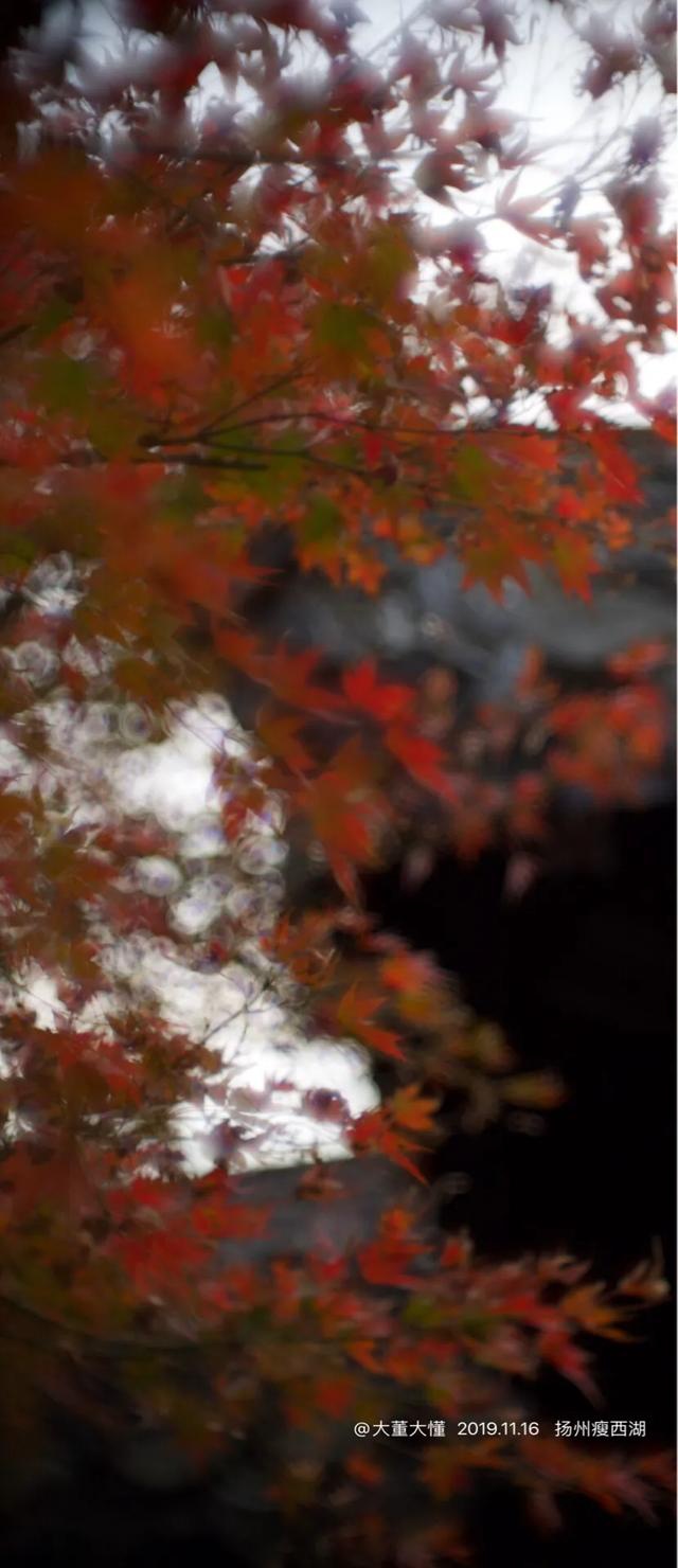 李清照说绿肥红瘦,这可比瘦西湖。时令过霜降,扬州还未降温,瘦西湖不冷,只是一些树叶红了,一些有锈色。天渐晚,瘦西湖两岸有一些灯光,确明亮。瘦西湖显得有些瘦。