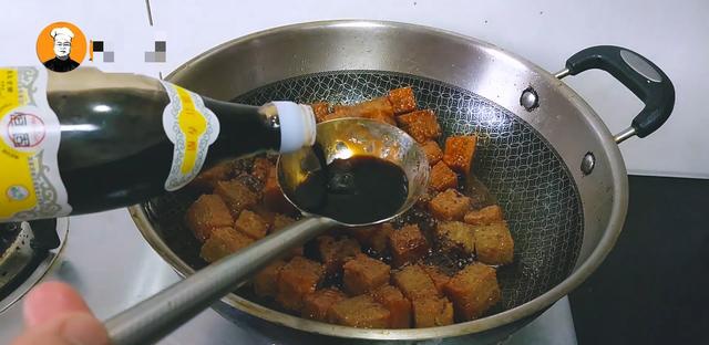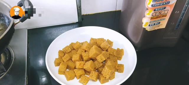 5、锅烧热后倒入大豆油,等油温升至六七成热时把烤麸倒入锅中炸5分钟,直至色泽金黄捞出,烤麸油炸之前不用水洗否则水进了烤麸小孔很难炸干,烧制时也容易入味