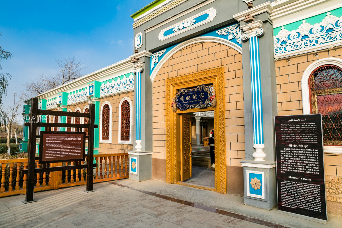 在“香妃”的家的不远处,就是著名的“香妃墓”,华丽又壮观。相传香妃死后,其遗体运了3年才回到喀什,也有说法是三个月。这座陵墓始建于1640年,据说墓内葬有同一家族的五代72人(实际只见大小58个墓穴),在当地人的指认下,香妃的墓穴位于整个家族中的位置非常偏,且很小,非常不明显。但据考证,“香妃”并没有葬在这里,她确切的葬地是在河北遵化清东陵的裕妃园寝。