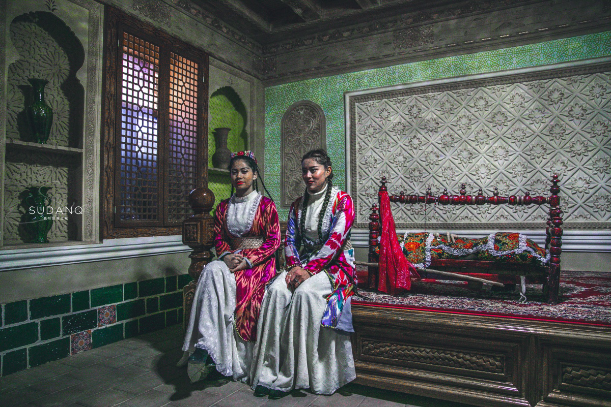 这间昏暗又不乏格调的小屋,据说是“香妃”出生的地方,两个漂亮的侍女坐在一边,好似婴儿床正躺着大清皇帝未来的爱妃呢。