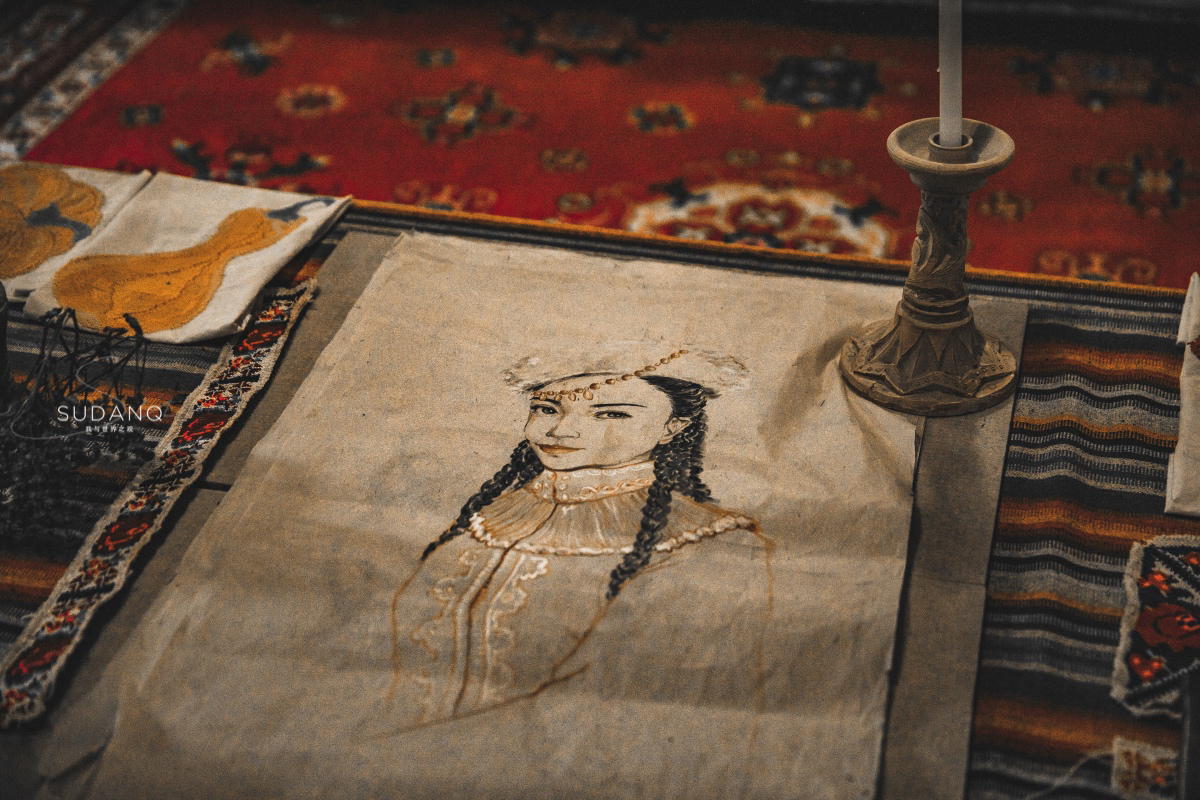 这是“香妃”未进宫前居住的寝室,真的是非常非常豪华,且充满异域风情。在床边还摆放着一张“香妃”旗装像,虽是油画形式展现,但这样的“香妃画像”流传最广。如今“香妃”早已不再,但侍女仍在陪伴画像左右。