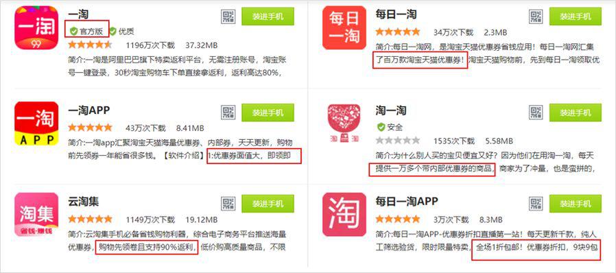 比如,在我搜淘宝旗下的「一淘」时,出现了很多长得特别像的 App ,他们除了名字、图标高仿正版软件外,无一例外都在用尽力气强调:这里有优惠,还能返现,快来买呀 ……