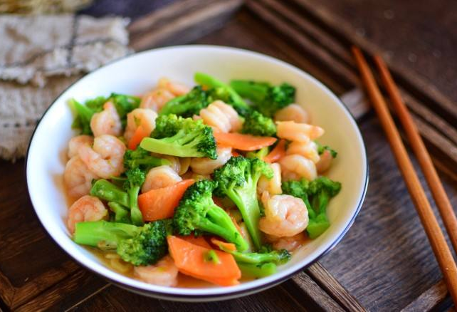 4、炒锅内加入适量食用油,油烧热后下入蒜末爆香,然后放入西蓝花、胡萝卜翻炒一下,再加入虾仁,加盐、鸡精调味,最后淋上适量水淀粉,翻炒均匀后装盘即可。