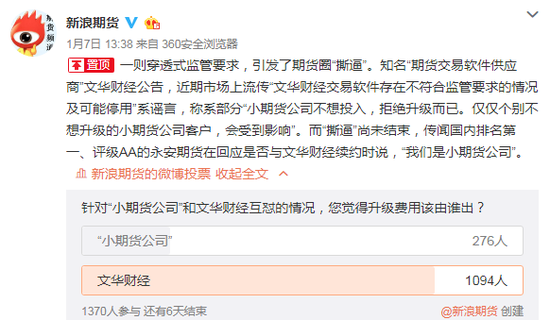 公告一出,引起了期货圈的热烈讨论,7日下午,新浪期货针对这一热议进行了投票调查,截止目前,已有1370名读者参与,其中认为升级费用应该由文华财经承担的人数占比接近70%。