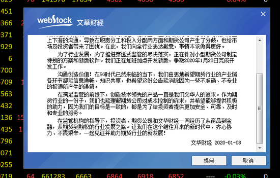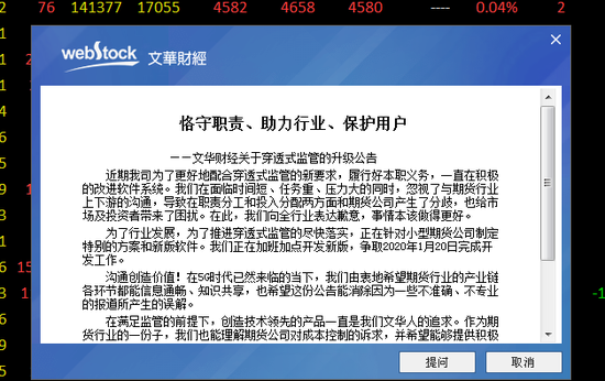 此前,“期货交易软件供应商”文华财经曾发布公告称,近期市场上流传“文华财经交易软件存在不符合监管要求的情况及可能停用”系谣言,称系部分“小期货公司不想投入,拒绝升级而已。仅仅个别不想升级的小期货公司客户,会受到影响”。
