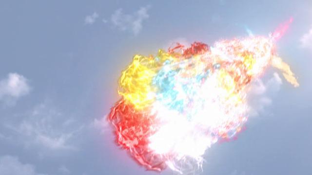 在三重斯特利姆形态下,使用四人小队的力量,将彩色的能量汇聚三重剑,然后从剑尖释放红黄蓝白四色的旋转型火焰光线,这是三重泰迦目前的最强光线技能。在泰迦最后,三重泰迦使用此招给予托雷基亚最后一击。