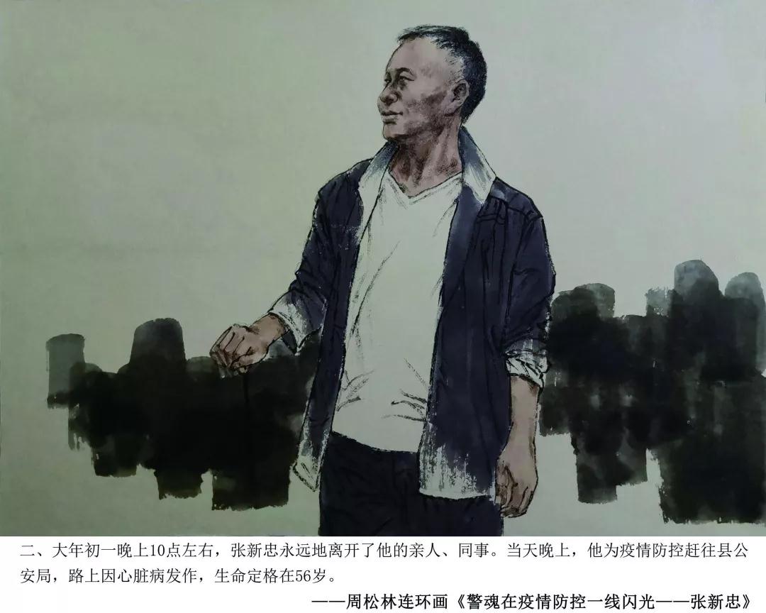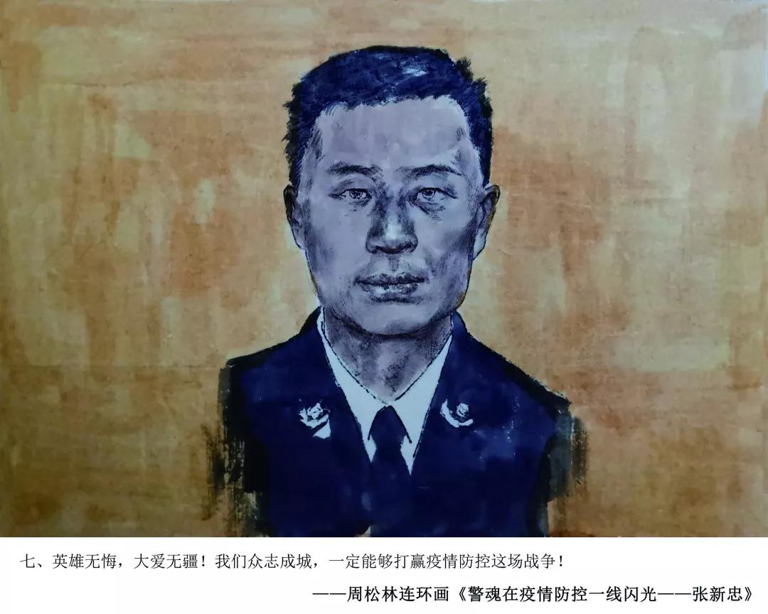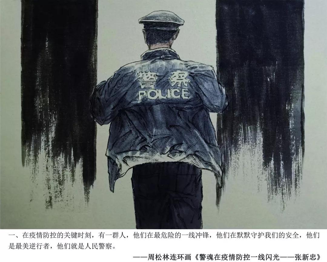青岛市书画艺术促进会周松林副主席,在创作完成医护员工战疫情连环画得到社会点赞后,应山东省文联、山东省美协紧急约请,即投入到山东疫情防控牺牲在一线的民警张新忠感人事迹的忘我创作中。用画笔向抗击疫情一线的人民警察致敬,展现了一幅幅无畏疫情,冲锋在前的警魂壮歌。