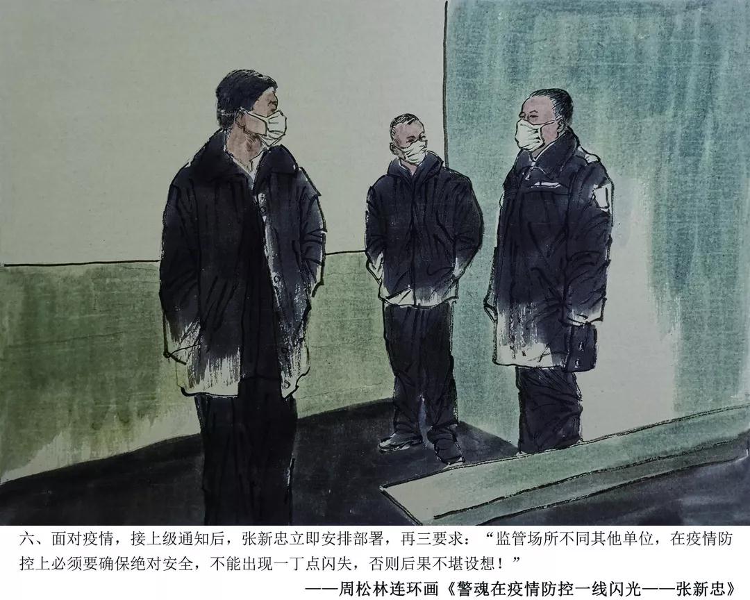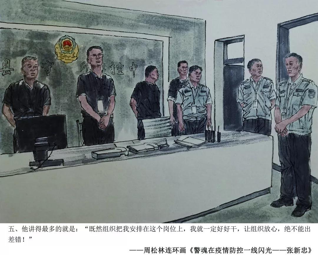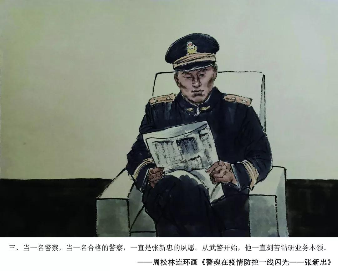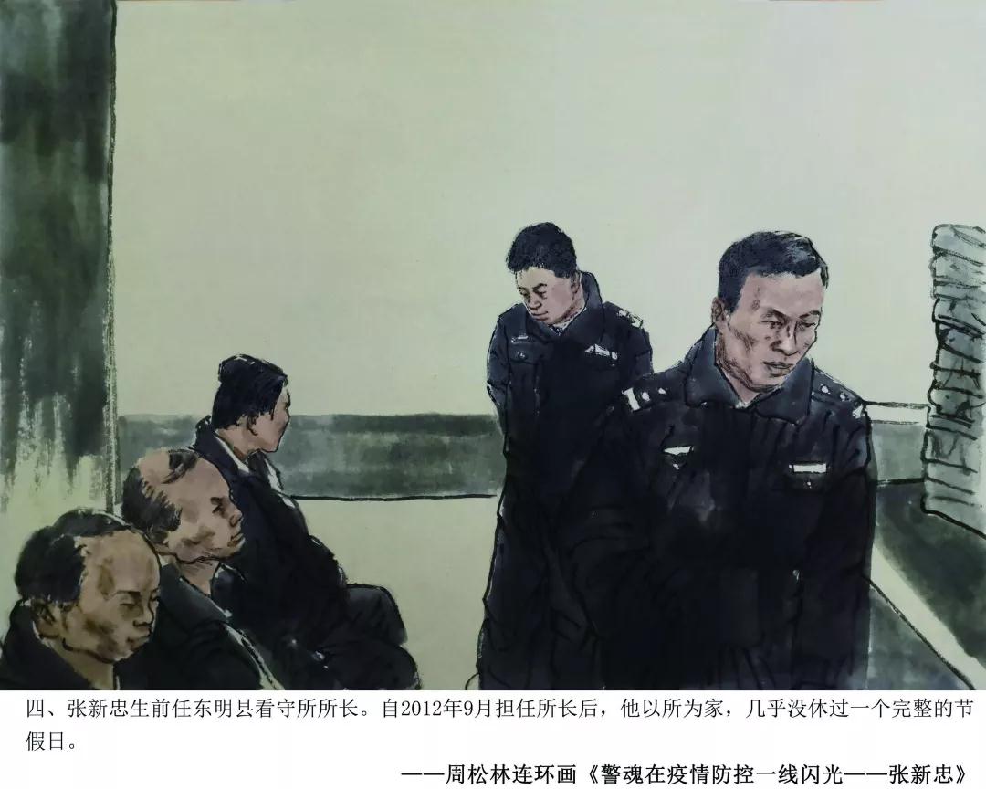 青岛市书画艺术促进会周松林副主席,在创作完成医护员工战疫情连环画得到社会点赞后,应山东省文联、山东省美协紧急约请,即投入到山东疫情防控牺牲在一线的民警张新忠感人事迹的忘我创作中。用画笔向抗击疫情一线的人民警察致敬,展现了一幅幅无畏疫情,冲锋在前的警魂壮歌。