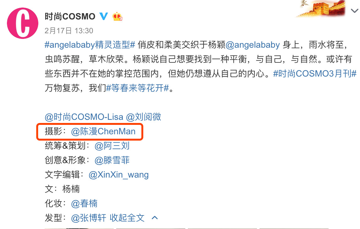 而Angelababy的封面拍摄团队,则请到了陈漫,稍微熟悉时尚圈的人都知道,陈漫可是摄影圈的顶流。如果自家爱豆被陈漫拍了,那就是娱乐圈地位的象征。