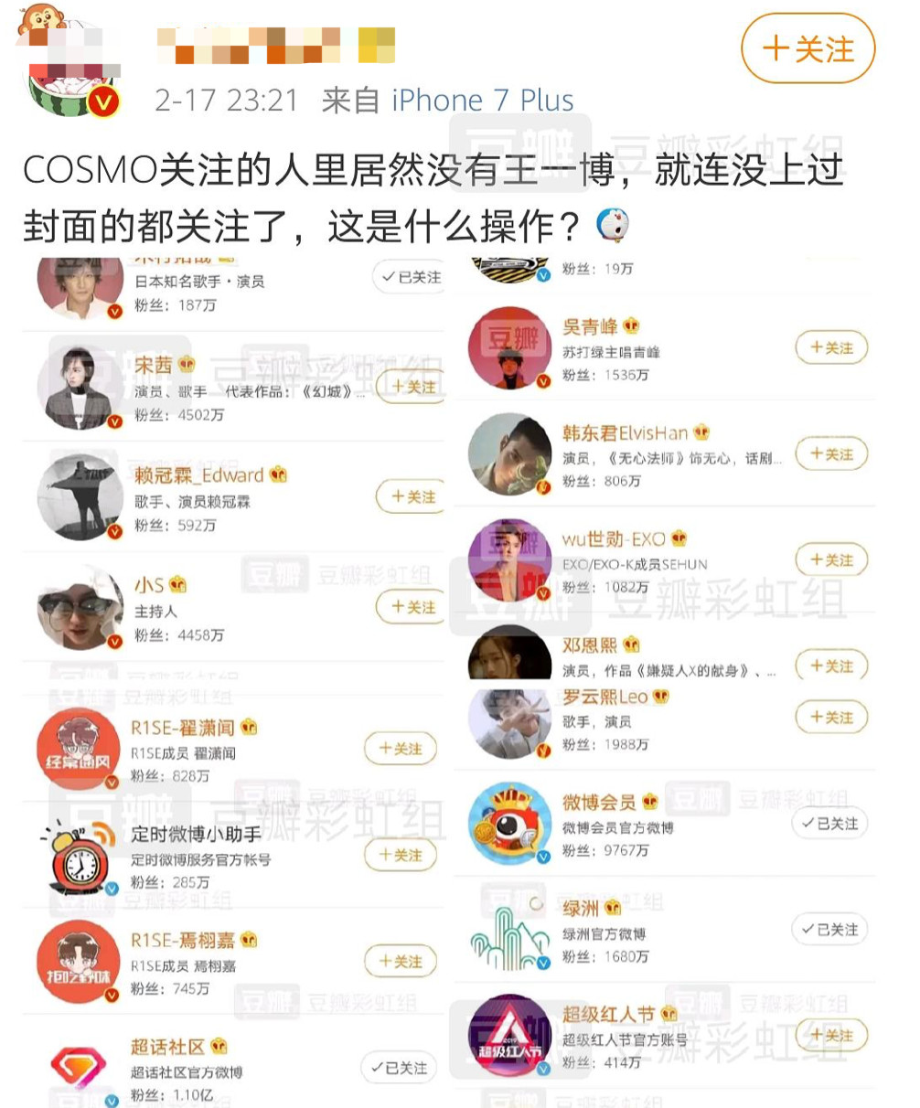 还有网友发现,时尚Cosmo杂志的官微关注了每一位曾经合作过的明星,但这次王一博却不在她的关注列表之内,这也被看作杂志并不那么重视王一博的证据。