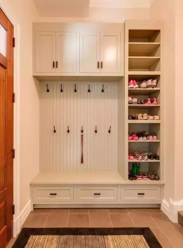所以建议可选择做封闭式柜子和开放式结合的做法,开放式的设计也可以放在玄关的侧边,这样就更不会沾染灰尘了。