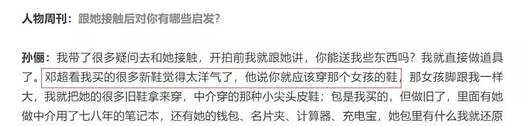 为了更加贴近人物,孙俪也跟她请教很多房产中介需要做的事情,比如中介的鞋一般都很少,一双鞋能搭配很多套衣服,在老公邓超的建议下,孙俪甚至还把她的旧鞋拿来穿。