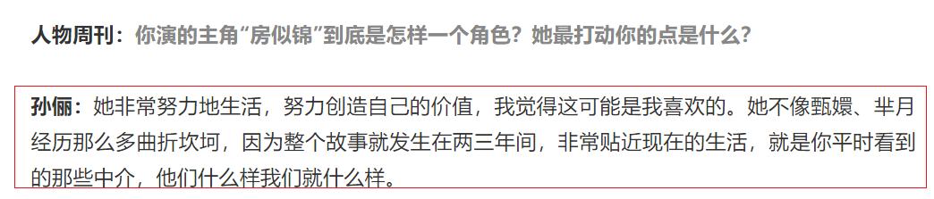 这些年里,孙俪演过很多大爆剧的女主角,比如《甄嬛传》里的甄嬛、《那年花开月正圆》的周莹,但她们都是离观众很遥远的人物,房似锦却不同,作为房产中介,她更像是我们现实中认识的某个人,所以也更加能打动人。