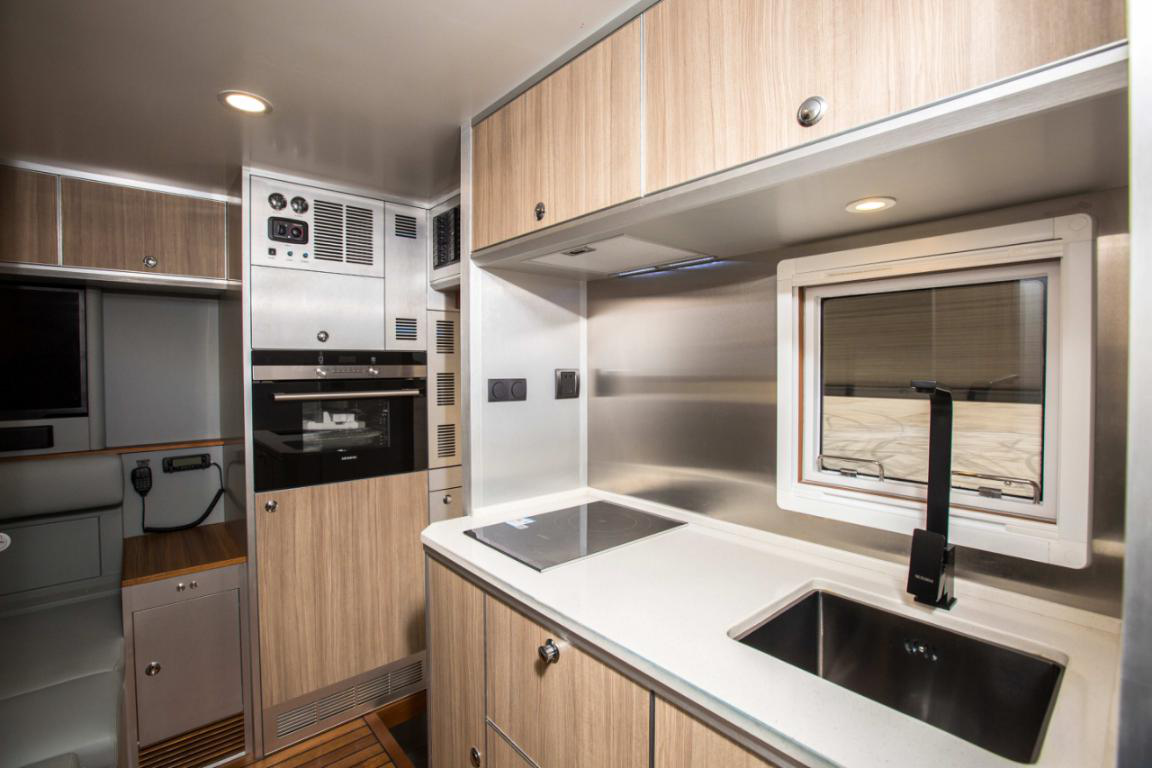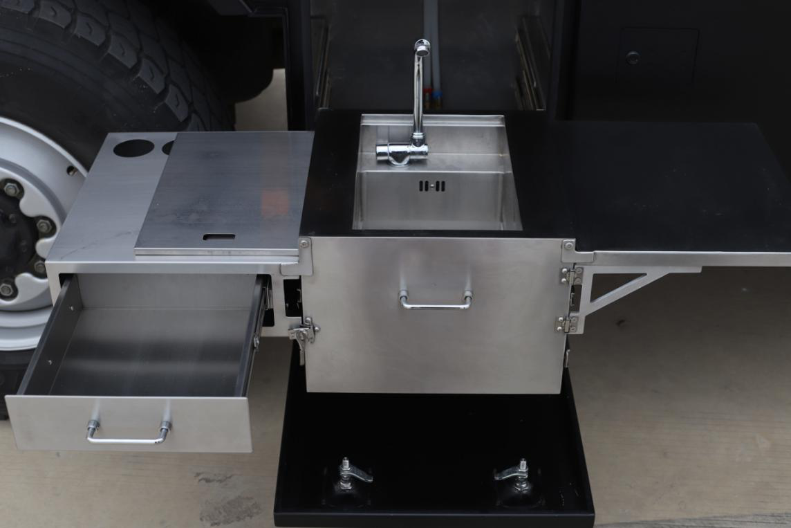 如果车内的厨房还不能实现你烹饪的空间,那么车身外侧的小型户外厨房可以给你充分施展厨艺的天地。