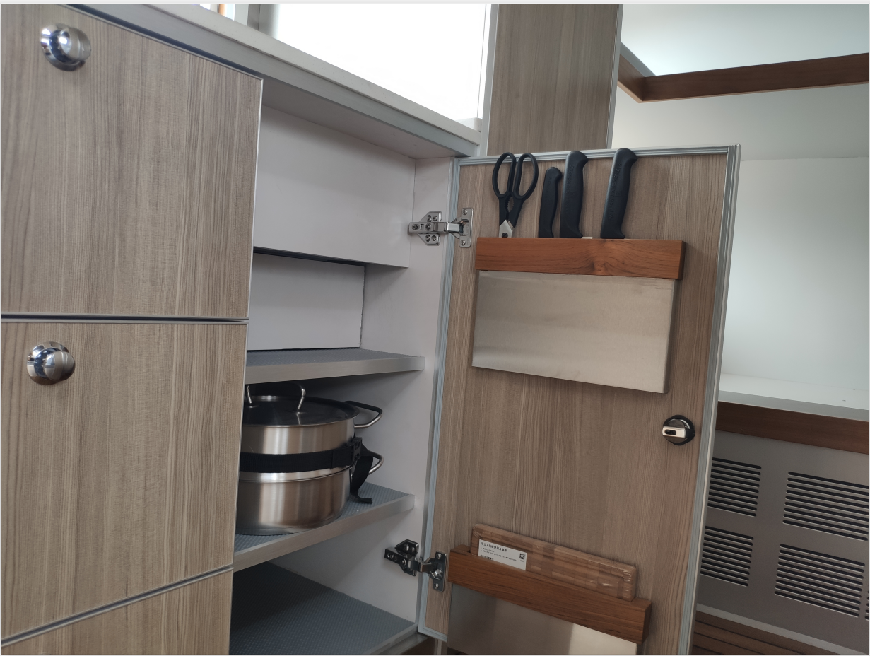 “穿越者M”内配置了单灶台的德国西门子电磁炉、抽油烟机及用来洗菜、洗碗的单水槽。餐具、碗筷、煮饭、炒菜的锅都一应俱全,而且还有德国双立人案板、刀具套件,彰显了豪华的身份。