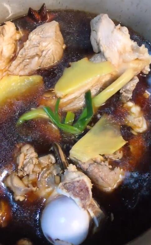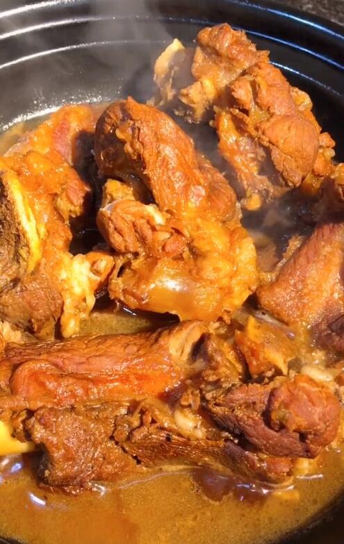 6、20分钟后打开电高压锅,肉质松软,骨肉差不多要分离了,然后把锅里所有东西都倒回铁锅里,转大火收汁就可以出锅啦,淡淡的酱香,看着味道就很诱人。