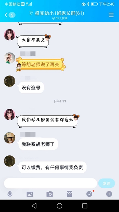 期间,有家长不放心河南收款方,直接给刘老师打电话确认,刘老师表示,从未发过通知。这位家长立刻通知群里其他家长:这是骗子,不要再转账。