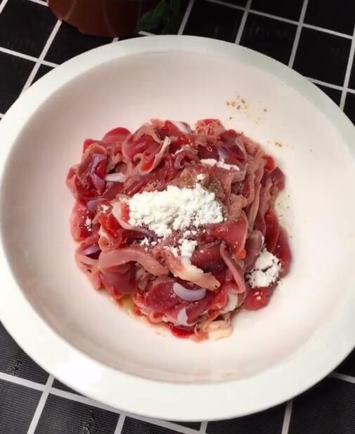 2、切好的鸡胗中加入适量盐、胡椒粉、料酒、一点生粉,用手抓拌均匀,腌制10分钟备用;
