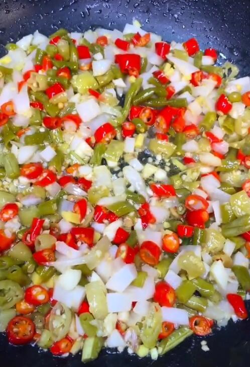 4、锅中留少量底油,放入姜、蒜末,小火炒香,然后下入切好的泡椒、酸萝卜、酸豆角、小米椒,大火煸炒出香味;