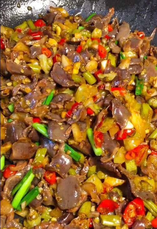 6、出锅前加入一些蒜苗,快速翻炒几下就可以出锅啦,这道香脆爽口、开胃又下饭的酸辣鸡胗就做好了,自己做经济实惠,几块钱的鸡胗就能炒一大盘。