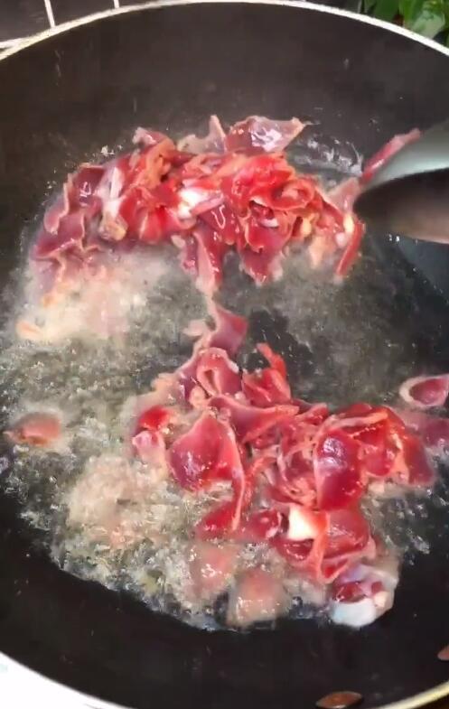 3、锅中加入足量油,4成油温下入腌制好的鸡胗,用勺子快速将鸡胗划散,将鸡胗滑熟,然后捞起装盘备用;