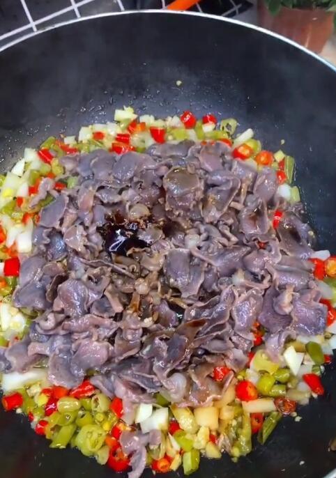 5、下入鸡胗,放适量鸡精、一小勺生抽、红烧酱油上色,不需要再加盐,然后大火爆炒,翻炒几下,然后加入少量白醋,快速翻炒均匀;
