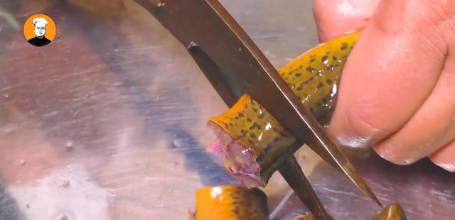 4、先把黄鳝身上擦点食盐去除表面的粘液,表皮颜色变掉,清洗干净,用剪刀黄鳝血放出来。再把黄鳝捞出来,把黄鳝肚子剪开去除内脏,把处理干净的黄鳝剪段,烧粥的黄鳝段剪得小一点