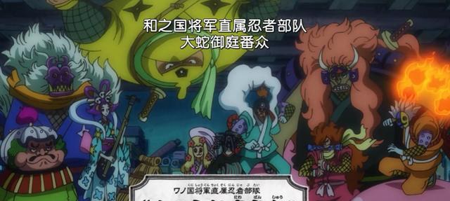 然而,也不要小瞧黑炭大蛇附近的护卫。身为和之国将军的黑炭大蛇,有着名为“大蛇御庭番众”的直属忍者部队。御庭番众负责保护、警戒和侦查的工作,从无声无息包围罗宾可知,这些人的实力还是挺不错的。