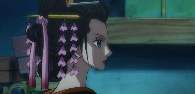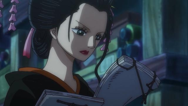 罗宾利用身为美女的优势,扮作艺伎,参加了黑炭大蛇举办的宴会。然而,身为和之国第一美女的小紫,成为众人的焦点,参会众人沉迷酒肉的时候,罗宾趁机离开宴会中心,潜入敌方房间搜寻情报。