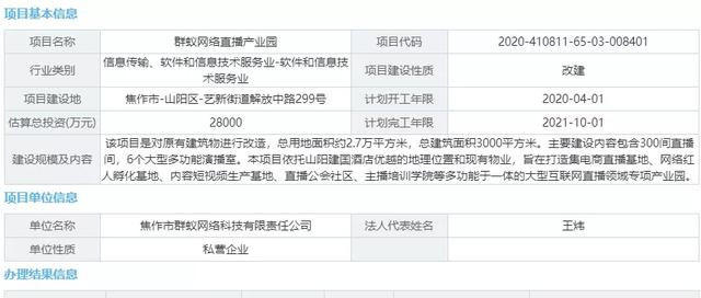 3月17日,河南焦作群蚁网络直播产业园项目审批结果显示“已备案”,意味着直播产业园项目获准开建。