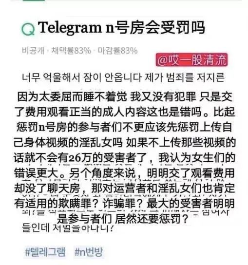 据韩媒报道,“N号房”付费聊天室会员超过26万人次,其中包括教授、艺人、著名创业公司CEO等知名人士。广大的男性同盟组成一张秘而不宣的巨大暗网。一张流传甚广的截图显示,一些入群观看的男性成员表示自己只是正常消费,并未做出进一步行为,并表示“委屈”。值得注意的是,因受害者中存在大量未成年人,此举除了道德上应受到谴责,在法律上这样的行为也构成违法犯罪。