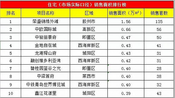 销售方面,胶州市的荣盛锦绣外滩以总成交套数135套、总成交面积1.56万㎡位列青岛市销售面积排行榜榜首;高新区的中欧国际城项目位列第二名,总成交套数56套、总成交面积0.66万㎡;即墨区的中骏丽景府项目以总成交套数50套、总成交面积0.47万㎡位列双榜排行榜第三名。