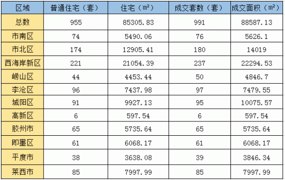 其他区域,城阳上周成交二手房95套,成交面积10075.57㎡;莱西上周成交二手房85套,成交面积7997.99㎡;市南上周成交二手房76套,成交面积5626.1㎡;胶州上周成交二手房65套,成交面积5735.64㎡;即墨上周成交二手房61套,成交面积6068.17㎡;崂山、平度、高新区上周二手房成交均在50套以内。