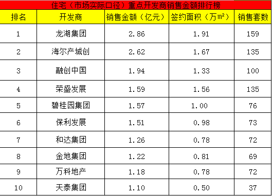 开发商销售金额方面,龙湖集团、海尔产城创、融创中国三家开发商成交额最高,在开发商销售榜单中排名第十的天泰集团仅卖出了37套。