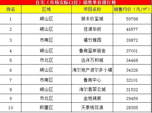 从单价排行榜来看,位于崂山区“最贵城中村”山东头的银丰玖玺城项目以59788元/㎡的销售均价位列榜首,佳源华府以46577元/㎡位居第二,禧竹雅园以39872元/㎡的价格位列第三。值得注意的是,崂山区、市南区、市北区以及即墨四区包揽上周楼盘单价十强榜。