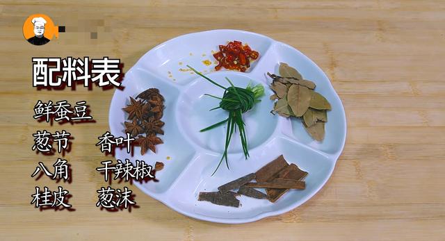 鲜蚕豆、葱结、香叶、八角、干辣椒、桂皮、葱末