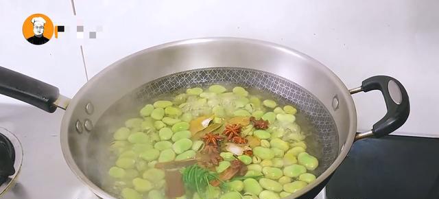 4、先把鲜蚕豆放入水中洗干净,捞出备用。锅中烧上开水,把蚕豆放入锅中,再放入葱结、香叶、桂皮、八角、盐两勺,大火烧开中小火再烧七八分钟,把蚕豆完全烧熟