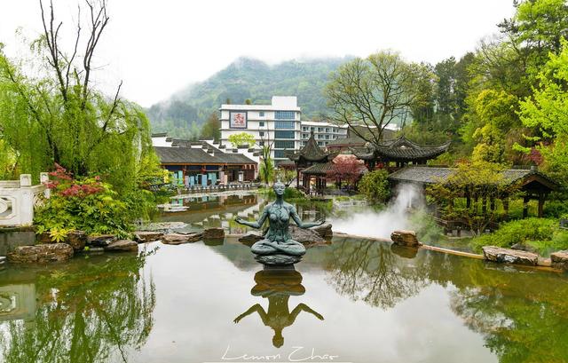 拾级而上,只见一佛像端坐池中,神态慈祥,呈欢迎姿势。鱼翔浅底,烟波袅袅,一片泰然祥和之姿。亭台楼阁,缓步其间,忽见齐云小镇。