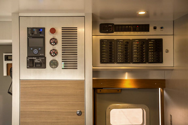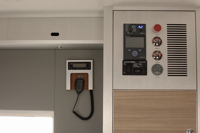 主舱门上方有两个汇总控制面板,这些密密麻麻的按键可以操控电器,包括清水箱和灰水箱的水位也可查看。还有一个显眼的红色圆按钮,它是一个紧急按钮,当发生问题故障时需要断电就可拍下此按钮,一拍就可将电器电源切断。面板的左边配备着对讲机,方便大家交流沟通。