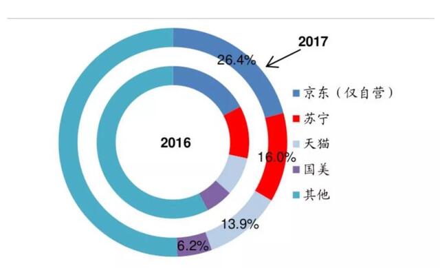 到2017年时,京东已占到全渠道份额的26.5%,国美屈居第四占比6.2%。