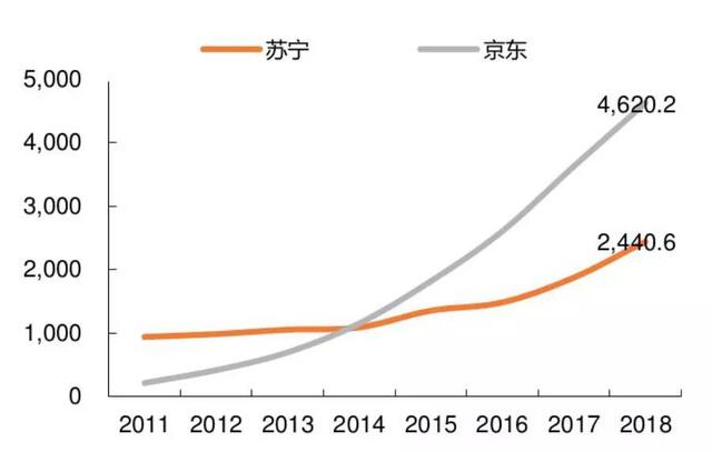 苏宁、京东主营业务规模(单位:亿元) 来源:平安证券研报