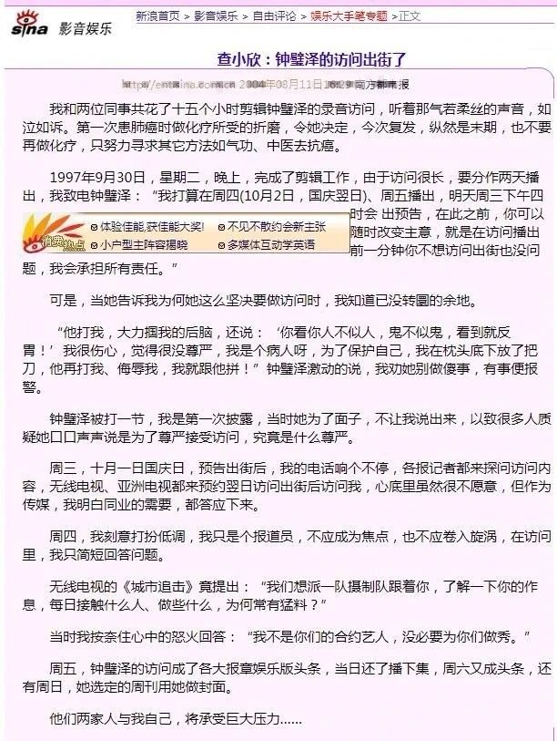 钟璧泽在85年患癌,98年因病去世,而在这期间,作为钟璧泽好友的章小蕙却和陈曜旻堂而皇之地在一起了,丝毫没有顾忌钟璧泽的病情。