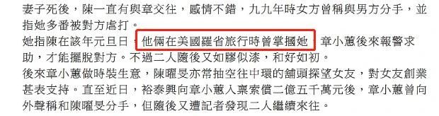 章小蕙在那段时间也不再是被捧在手心的小公举,本就是家暴历史的陈曜旻对章小蕙也施行过暴力行为。