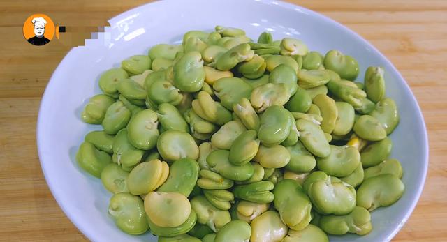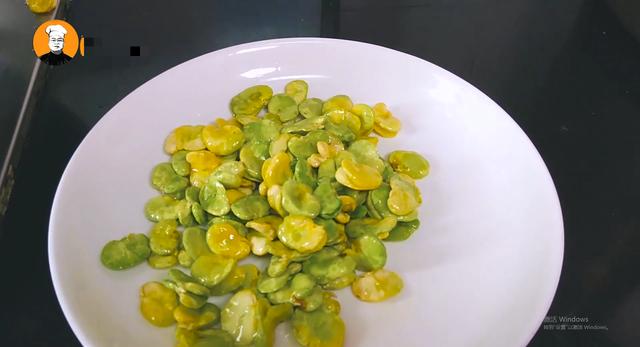 5、锅控干后倒入适量大豆油,等油温升至六七成热时,放入蚕豆瓣,蚕豆水分榨干炸三到四分钟捞出,等油温再次升至六七成热时,放入蚕豆瓣复炸两到三分钟,直至炸制蚕豆瓣酥脆,沥干油备用