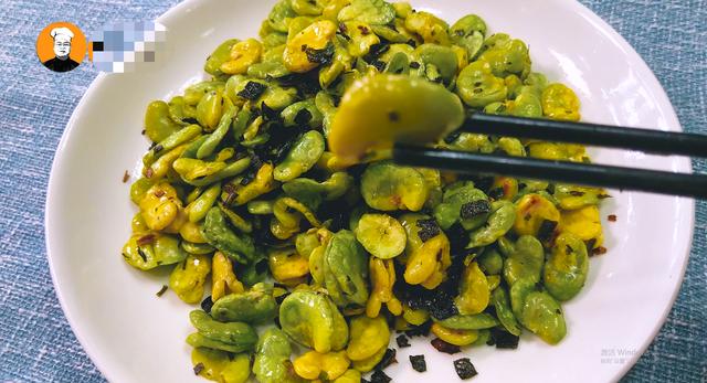 6、另起油锅,锅中放入葱末爆香,再放入炸好的蚕豆瓣翻炒片刻,放入一小勺盐继续翻炒入味,放入海苔丁继续翻炒片刻即可装盘。一盘简单美味的台条油酥豆瓣就做好了