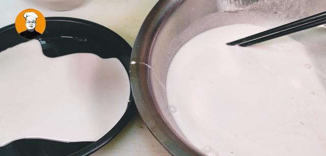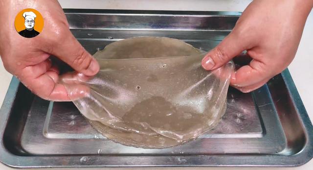 5、放入烧开的蒸锅中大火蒸两分钟,蒸到上面起大泡就可以了,拿出放在凉水盆中,轻轻拉一下就下来了,透明的粉皮就做好了,每层上面都擦上一层油防止粘连再一起,同样方法做好所有的粉皮